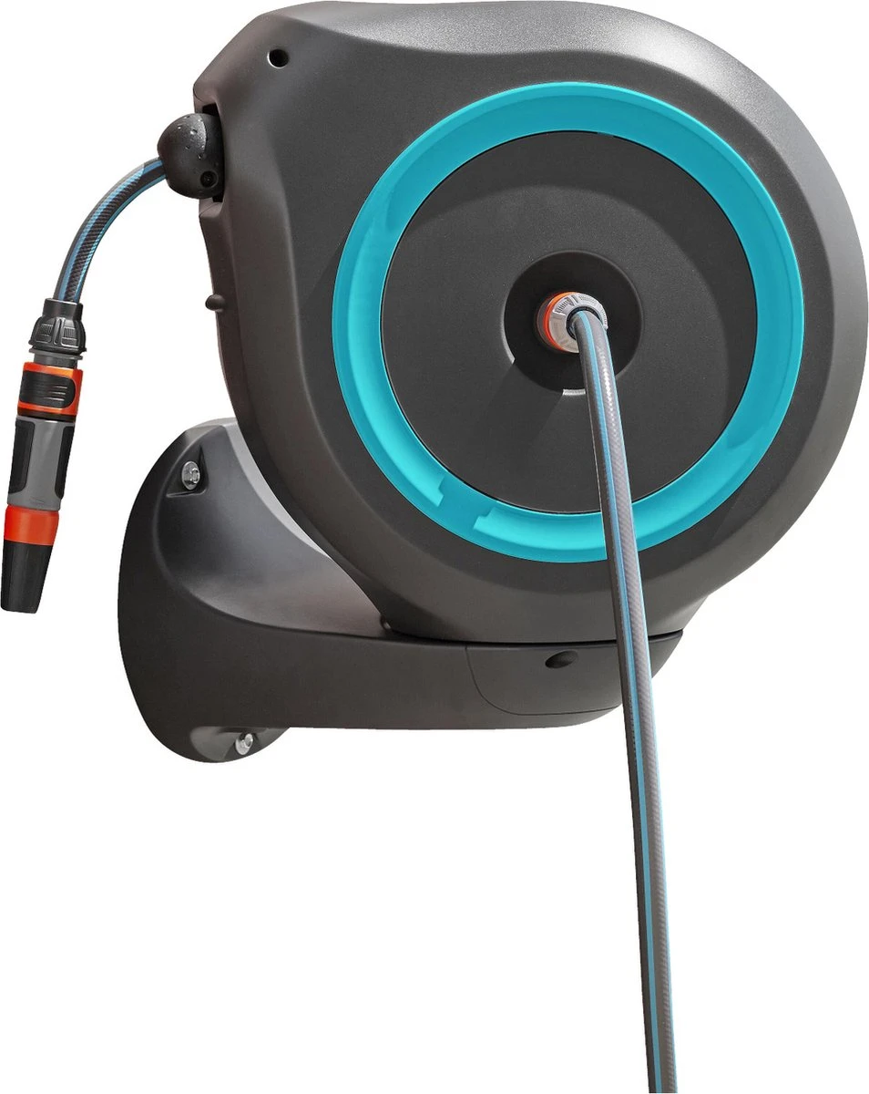 Met de Wandslangenbox RollUp M is het bewateren van een grote tuin aangenaam en eenvoudig. Je bevestigt de compacte slangopslag permanent op de muur van het huis en sluit deze met een aansluitslang aan op de kraan. Dankzij de 20 meter lange slang en de 180 graden draaibare slangenbox is het heerlijk om je planten te bewateren en is dit geen corvee meer. De slangenhouder volgt je bewegingsrichting en voorkomt dat de slang gaat knikken of in de war raakt. Nadat je de slang tot de gewenste lengte voor het bewateren hebt uitgetrokken, grijpen de zeer korte vergrendelingspunten zich automatisch vast en blokkeren ze de slang zodra je stopt. Door lichtjes aan het uiteinde van de slang te trekken, wordt het vergrendelmechanisme ontgrendeld en wikkelt een geïntegreerde stalen veer de verlengde tuinslang volledig automatisch, betrouwbaar en gelijkmatig voor je op. Dankzij de innovatieve RollControl-technologie gebeurt het oprollen veilig en gecontroleerd. De geïntegreerde slanggeleider zorgt ervoor dat de slang netjes en gelijkmatig wordt opgerold, zonder dat deze in de knoop raakt. De kraan- en slangaansluitingen van de slangenbox maken deel uit van het Original GARDENA System, zodat je op elk gewenst moment andere GARDENA opzetstukken kunt aansluiten. Je hebt altijd je GARDENA mondstukken bij de hand: ze kunnen onder de muurbeugel worden bevestigd en daar worden opgeborgen om ruimte te besparen. Het hoogwaardige materiaal is UV- en vorstbestendig en bestand tegen weersinvloeden. Daarom kan het systeem het hele jaar door worden gebruikt. Bovendien is de slangopslag beveiligd met een antidiefstalvoorziening. Alle benodigde aansluit- en montageonderdelen worden bijgeleverd in de wandslangenbox RollUp: een muurbeugel, een aansluitslang, alle benodigde Original GARDENA System onderdelen en een mondstuk met twee verschillende sproeiopties.